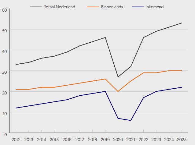 In 2025 groeit het verblijfstoerisme naar verwachting met 2,7% naar 53 miljoen (inter)nationale verblijfsgasten. Dit is een licht positiever beeld dan eerder verwacht begin dit jaar (+2,5%) en kan leiden tot 1,4 miljoen meer verblijfsgasten in 2025. Dit komt door een sterkere groei dan verwacht voor internationale bezoeken. Dit staat in de laatste forecast van NBTC.